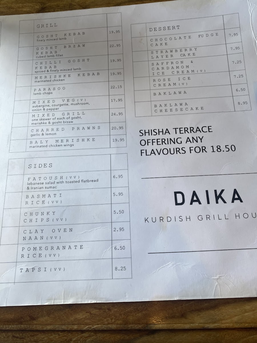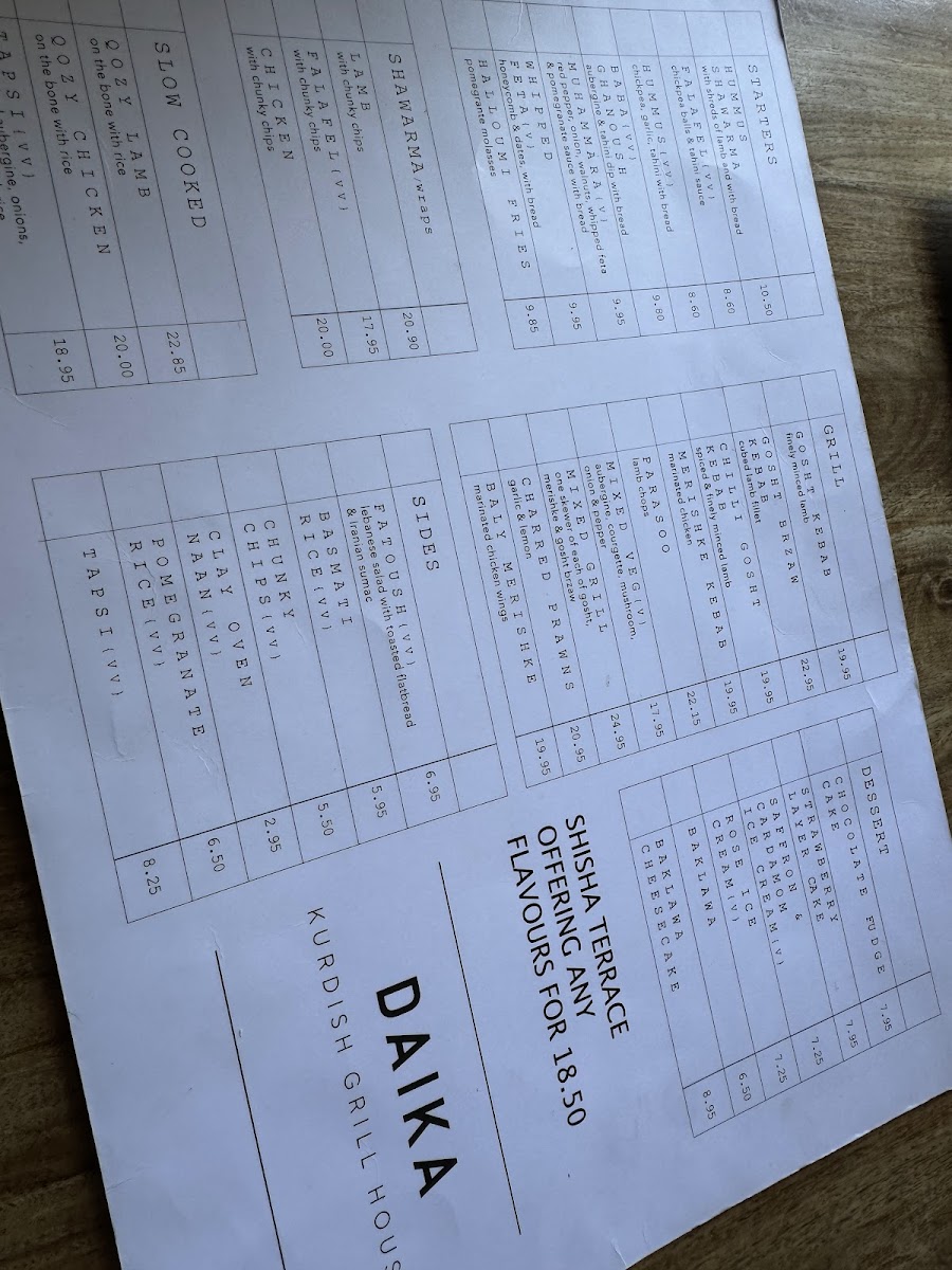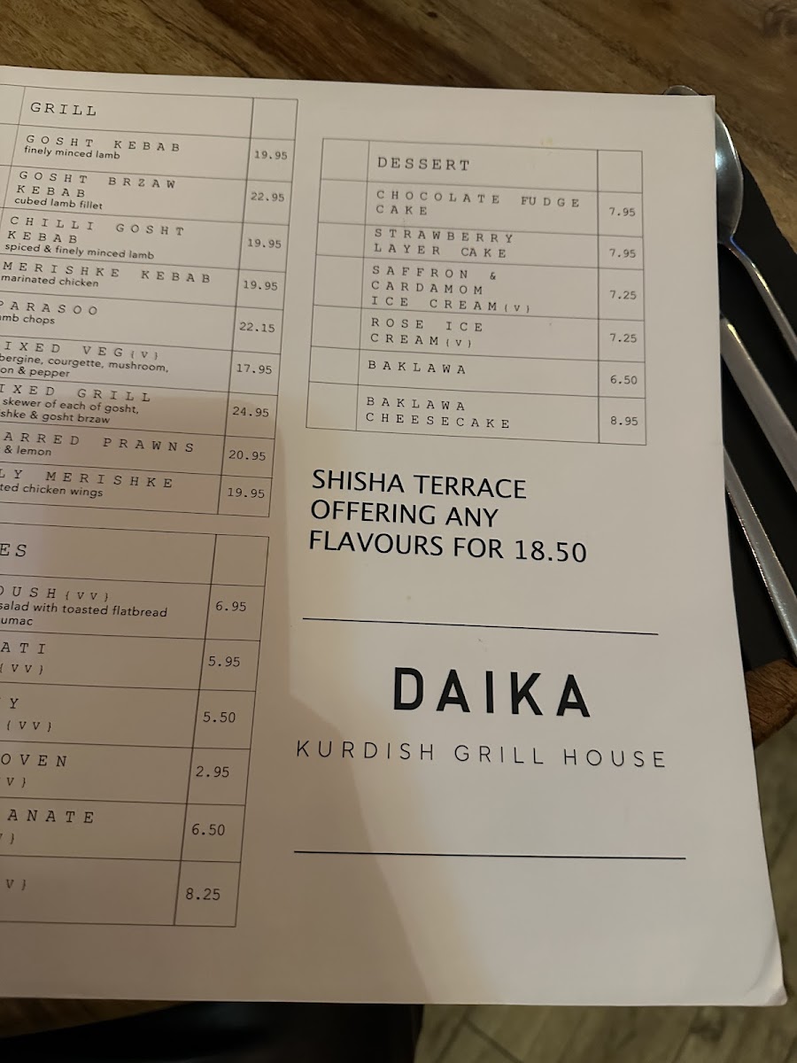 Overall, Daika Kurdish Grill offers a delightful culinary journey through Kurdish cuisine, with a well-curated menu and a focus on quality, fresh ingredients. It’s a must-visit for anyone looking to explore the rich flavors of this unique cuisine in Edinburgh.